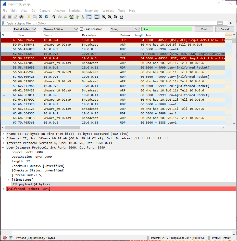 Since I know the flag format is picoCTF{}, I tried to do a simple search for pico by using Edit -> Find Packet. I made sure to select the Packet bytes option from the dropdown menu in the upper left. This yielded a hit on packet number 55: