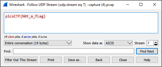 I picked a random packet in this list, right clicked on it, and selected Follow -> UDP Stream. This gave me a string that looked like the flag, but wasn’t the solution: