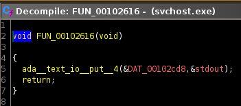 Each of these functions are similar, calling ada__text_io__put__4. Reading Ada documentation, I figured out that Put writes a single character. Each of these calls has a second parameter which pointed to a location in memory with 1, which is stdout: